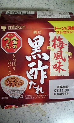 それで今日は私の好きな面白納豆を紹介したいと思いますよ^^何 画像を見るとわかるのですが、納豆の「梅風味・黒酢たれ」ですよっ><!そのまんまですよまじで^^う~ん・・なんと言ったらいいのか;味は納豆のたれが梅味になった感じです^^と言ってもわかりづらいヾ(゜∀、゜)ノシw後味はさっぱりしていてしつこくなく、納豆の後味が苦手!ってな方だったら結構いけるのかと思います^^w勿論納豆好きさんにも、是非!一度食べて欲しい味です^^!本当に美味しいんです!納豆の革命ですよっっ!普通の納豆の味に飽きちゃった・・・という方なら尚更おすすめしますしねb