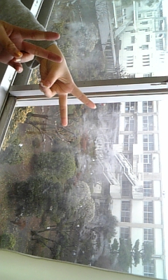 教室から見た風景with友人たちの手